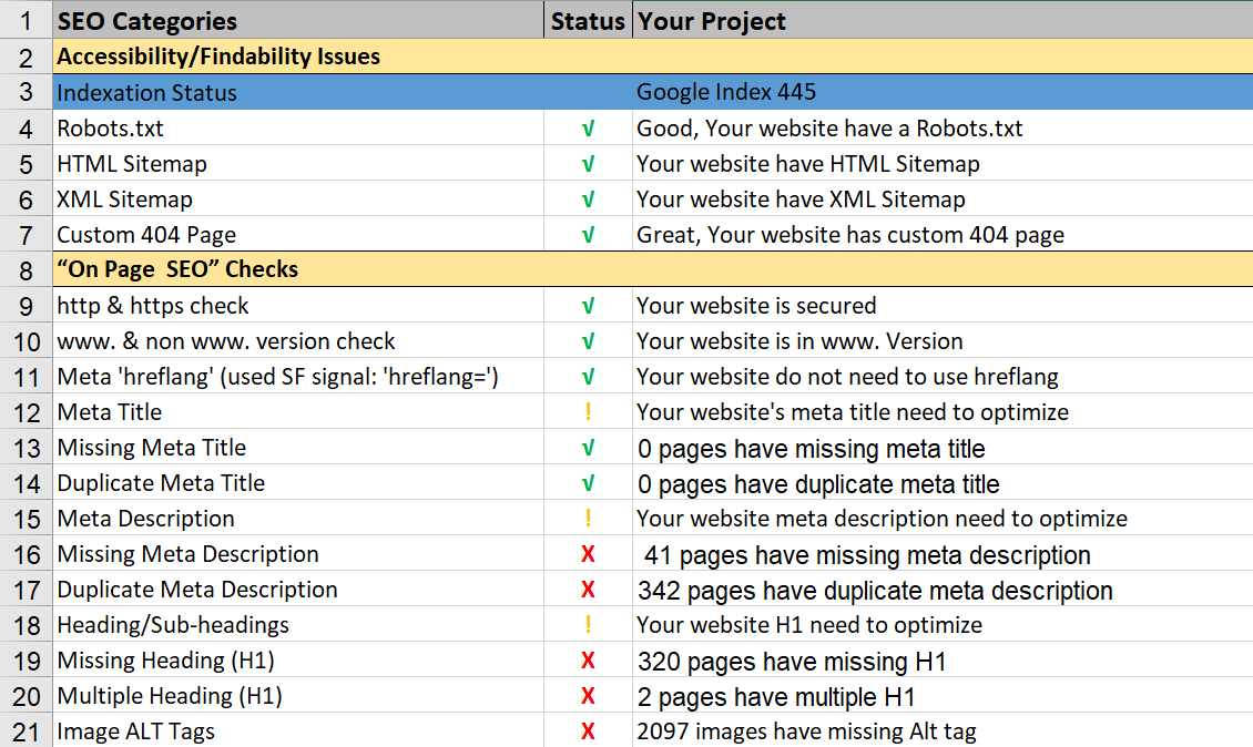 - Website Audit: A website audit is like a health check-up for your website. It involves a comprehensive review and analysis of various elements to assess the overall performance, usability, and effectiveness of a website. Regular audits are essential to keep your website in top shape, adapt to evolving digital trends, and maintain or improve your search engine rankings.